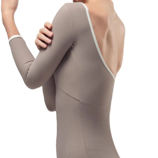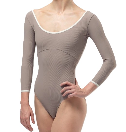 Ballettdrakt med 3/4-dels ermer. Rund hals i front og noe dypere rygg. Hvite kontrast kanter i hals og på ermene. Dette fremhever fargen mot huden. Ribbet materiale i 75% polyester og 25% elastan. Helforet i front.