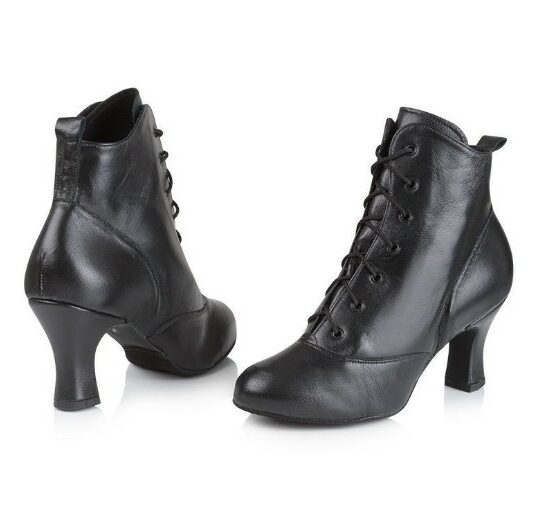 Skinnstøvel med lavt skaft. Snøring og glidelås på innersiden av leggen. 7,5cm snellehæl og semsket såle. Håndlaget i England. Produsert for scenebruk til kabaretartister, teaterartister og er perfekt til heels klasser.