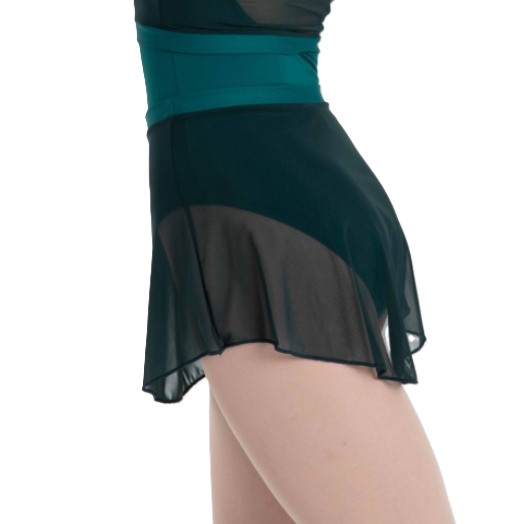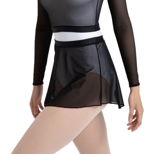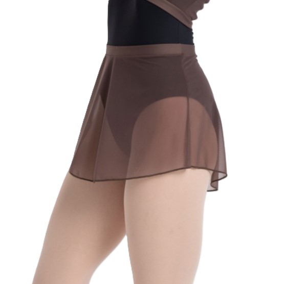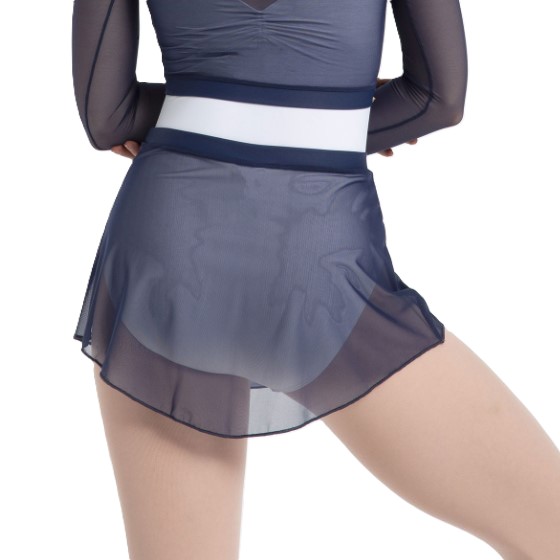 Kortere og gjennomskinnelig chiffongskjørt med bredere strikk i livet. Skjøret buer ned foran og bak, og går noe opp på hver side. 90% polyamid og 10% elastan. Produsert i Spania.