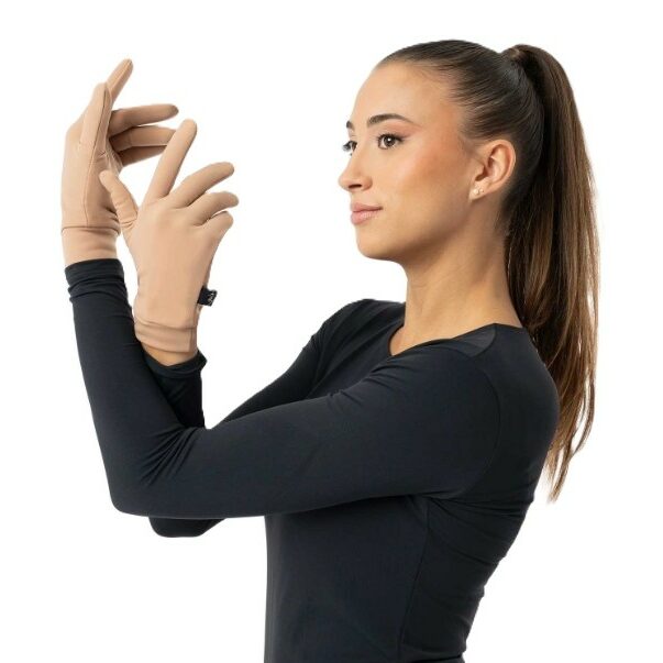 Hansker til kunsløp. Flosset på innsiden, så skal holde varmen på isen. 15% elastan og 85% polyamid som absorberer fukt og svette. Kommer i to størrelser.