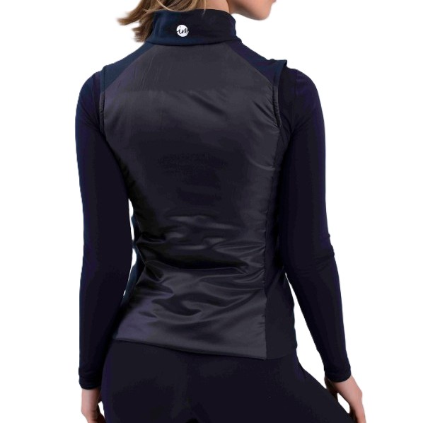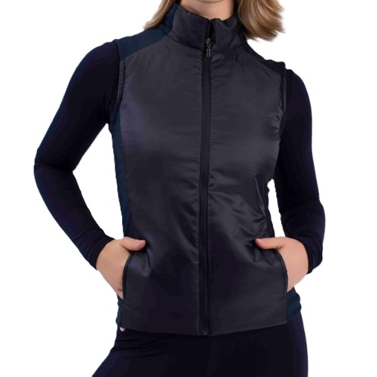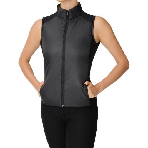 Varmevest med glatt boblestoff i front og bak på rygg. Stretchstoff i hver side og på skuldre. Liten hals, glidelås i front og lommer. 30% polyamid og 70% polyethylene. Produsert i Spania.