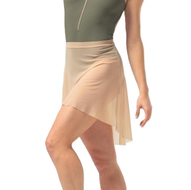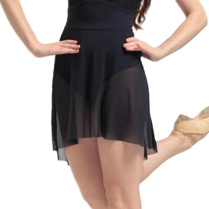 Vakkert ballettskjørt i elastisk meshstoff; 90% nylon og 10% elastan. Kortere foran og lengre bak. Produsert i Spania.